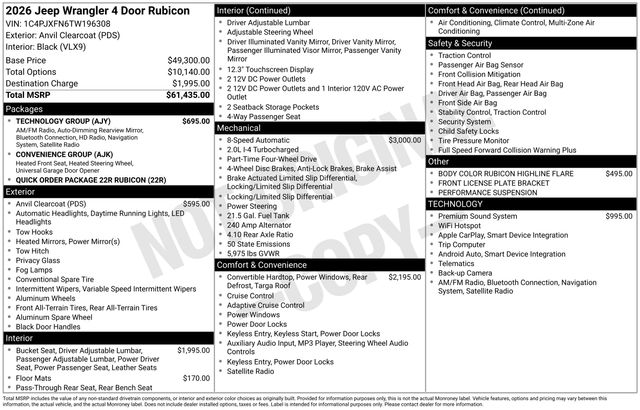 South Fork Chrysler Jeep Dodge Ram is very proud to offer this great-looking and fun 2026 Jeep Wrangler in Anvil Clear Coat. This vehicle has passed our comprehensive inspection and comes with the following features: 2026 Wrangler Rubicon