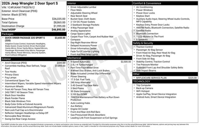 South Fork Chrysler Jeep Dodge Ram is proud to offer this wonderful-looking and fun 2026 Jeep Wrangler in Anvil Clear Coat. This vehicle has passed our comprehensive inspection and comes with the following features: 2026 Wrangler Sport S