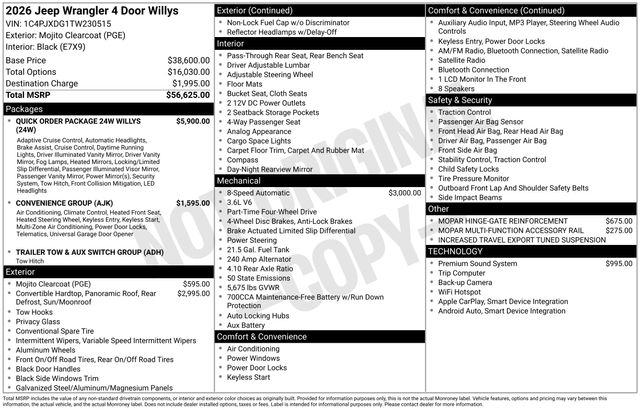 Discover the freedom and versatility of the 2026 Jeep Wrangler Willys. This exceptional 4x4 is more than just a vehicle - it's a gateway to a life of endless possibilities. Visit our showroom today to experience the power and capability of this remarkable Jeep for yourself. Art is for illustration purposes only. Not responsible for errors or omissions. All vehicle's are plus tax, title, license, official fees, equipment and destination fees.. Price includes: $1000 - 2026 National Retail Bonus Cash . Exp. 04/30/2026 $1500 - 2026 Southwest BC Bonus Cash . Exp. 04/30/2026 Price includes $25,186 of dealer added accessories.
