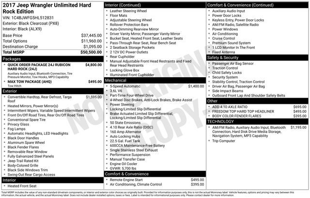 South Fork Chrysler Jeep Dodge Ram is pumped up to offer this terrific-looking and fun 2017 Jeep Wrangler in Black Clearcoat. This vehicle has passed our comprehensive inspection and comes with the following features: CARFAX One-Owner. Clean CARFAX. *4WD, Bluetooth, Hands-Free connection, Navigation!, Backup Camera, Cruise Control, Keyless Entry, Power Locks, Power Windows, Leather Seats, Hard Rock, 4-Wheel Disc Brakes, 40GB Hard Drive w/28GB Available, 8 Speakers, ABS brakes, Accent Stitching, Air Conditioning, Air Conditioning w/Auto Temperature Control, Air Filtering, Alpine 9-Speaker w/All Weather Subwoofer, Black/Chrome Screws Fuel Filler Door, Chrome/Leather Wrapped Shift Knob, Connectivity Group, Driver Height Adjuster Seat, Front Seat Back Map Pockets, GPS Navigation, Heated Front Seats, Hood w/Power Dome, Humidity Sensor, Jeep Trail Rated Kit, Leather Trimmed Bucket Seats, MOPAR Slush Mats, Outside temperature display, Performance Suspension, Premium Black Sunrider Soft Top, Premium EVIC Message Center, Quick Order Package 24J Rubicon Hard Rock (DISC), Red Front & Rear Tow Hooks, Red Trail Rated Badge, Remote USB Port, Rubicon Hard Rock Package, Rubicon Hood Decal, Security system, Silver Interior Accents, Speed control, Steel Front Bumper, Steel Rear Bumper, Tire Pressure Monitoring Display, Traction control, Uconnect Voice Command w/Bluetooth, Vehicle Information Center, Wheels: 17" x 7.5" Polished Semi-Gloss Blk (DISC).