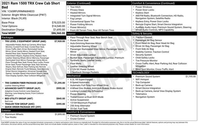 The TRX Carbon Fiber Package adds a touch of sophistication with its leather and carbon fiber steering wheel, while the Bed Utility Group and MOPAR accessories enhance the utility and versatility of this impressive truck. With a city fuel economy of 10 MPG and a highway rating of 14 MPG, this TRX offers a thrilling driving experience without compromising efficiency.