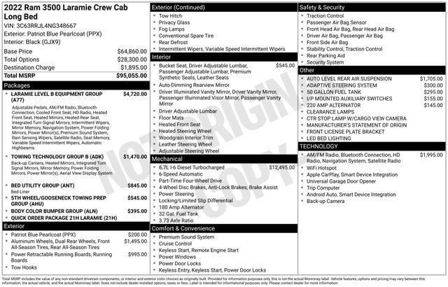 South Fork Chrysler Jeep Dodge Ram is pumped up to offer this good-looking 2022 Ram 3500 in Patriot Blue Pearlcoat. This vehicle has passed our comprehensive inspection and comes with the following features: Odometer is 18812 miles below market average! *4WD, Turbo Diesel Power, Bluetooth, Hands-Free connection, Navigation!, Backup Camera, Cruise Control, Keyless Entry, Power Locks, Power Windows, Leather Seats, Towing Package, Apple Carplay, Android Auto, 5th Wheel Set Up, 17 Speaker harman kardon Premium Sound, 2nd Row In Floor Storage Bins, 4-Wheel Disc Brakes, 4G LTE Wi-Fi Hot Spot, 8.4" Touchscreen Display, ABS brakes, Air Conditioning, Alexa Built-In, All R1 High Radios, All Radio Equipped Vehicles, Apple CarPlay, Apple CarPlay/Android Auto, Auto High Beam Headlamp Control, Auto-dimming Rear-View mirror, Automatic temperature control, Bed Utility Group, Body Color Bumper Group, Brake assist, Chrome Exterior Mirrors, Connected Travel & Traffic Services, Connectivity - US/Canada, CTR Stop Lamp w/Cargo View Camera, Disassociated Touchscreen Display, Electronic Stability Control, Exterior Mirrors Courtesy Lamps, Exterior Mirrors w/Heating Element, Exterior Mirrors w/Memory, Exterior Mirrors w/Supplemental Signals, Foam Bottle Insert (Door Trim Panel), For Details Visit DriveUconnect.com, For More Info, Call 800-643-2112, Global Telematics Box Module (TBM), Google Android Auto, GPS Antenna Input, GPS Navigation, HD Radio, Heated Second Row Seats, Integrated Center Stack Radio, Integrated Voice Command w/Bluetooth, Laramie Level B Equipment Group, Leather steering wheel, LED Bed Lighting, Mirror Running Lights, Mirror-Mounted Aux Reverse Lamps, MOPAR Deployable Bed Step, MOPAR Spray In Bedliner, Off-Road Information Pages, Painted Front Bumper, Painted Rear Bumper, Panic alarm, Power Adjustable Convex Aux Mirrors, Power Adjustable Pedals w/Memory, Power Chrome Tow Mirrors w/Convex Spotter & Memory, Power Deployable Running Boards, Power door mirrors, Power-Folding Mirrors, Quick Order Package 21H Laramie, Radio: Uconnect 5 Nav w/8.4" Display, Radio/Driver Seat/Mirrors/Pedals Memory, Rain Sensitive Windshield Wipers, Rear step bumper, Remote Tailgate Release, Security system, Selectable Tire Fill Alert, SiriusXM Radio Service, SiriusXM Satellite Radio, SiriusXM w/360L, Speed control, Surround View Camera System, Towing Technology Group B, Trailer Reverse Guidance, Trailer Tow Mirrors, Ventilated Front Seats.