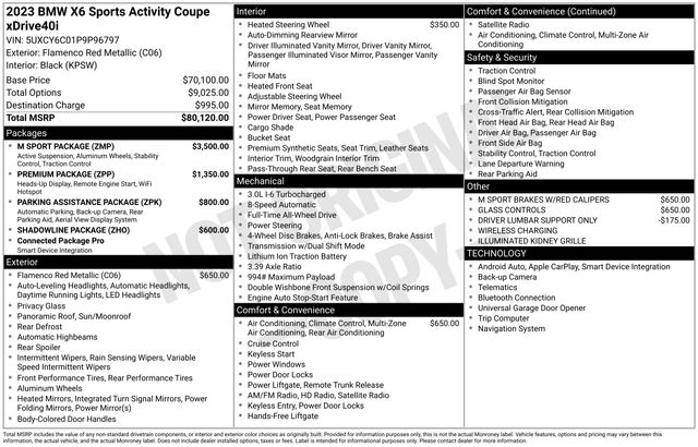 Beneath the sleek exterior, the 3.0L I6 DOHC 24V engine, paired with an 8-Speed Automatic Sport transmission, delivers a captivating blend of power and efficiency. With an EPA-estimated 21 MPG in the city and 25 MPG on the highway, this BMW X6 offers the perfect balance of performance and practicality.