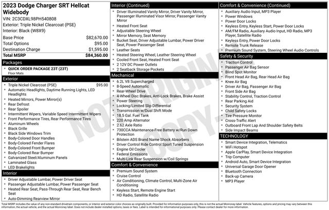 Adorned with a Hellcat Logo Laguna Leather Seat, Triple Nickel Clearcoat exterior, and the Quick Order Package 23T (DISC), this Charger Widebody is a sight to behold. Its impressive list of features includes: